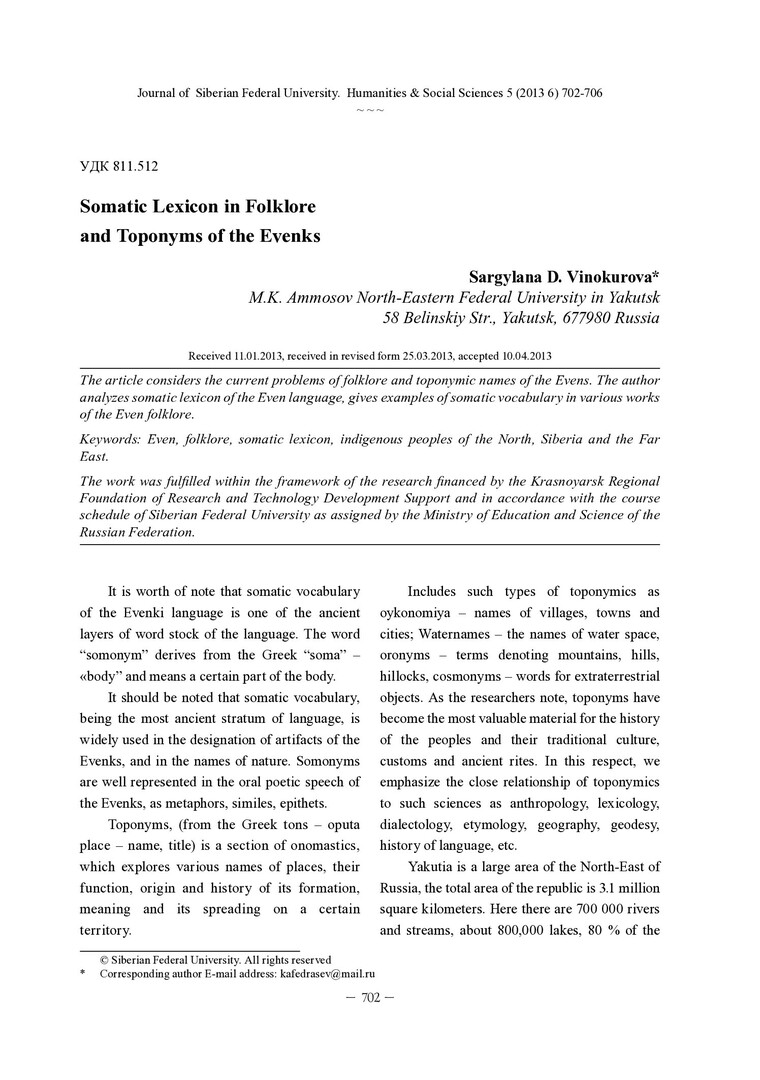 Библиографическое описание:Vinokurova, Sargylana. Somatic Lexicon in Folklore and Toponyms of the Evenks = Сомативная лексика в фольклоре и в топонимике эвенов / S. D. Vinokurova. - Текст : непосредственный // Журнал Сибирского федерального университета. Гуманитарные науки. - 2013. - Т. 6, № 5. - С. 702-706. - Библиогр.: с. 703 (5 назв.). - ISSN 1997-1370.