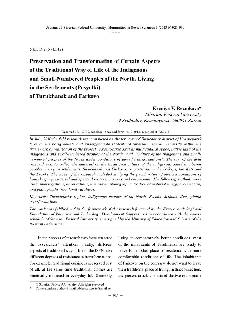 Библиографическое описание:Reznikova, Kseniya. Preservation and Transformation of Certain Aspects of the Traditional Way of Life of the Indigenous and Small-Numbered Peoples of the North, Living in the Settlements (Posyolki) of Turukhansk and Farkovo = Сохранение и трансформация некоторых аспектов традиционного образа жизни коренных и малочисленных народов Севера, проживающих в населенных пунктах (поселках) Туруханск и Фарково / K. V. Reznikova. - Текст : непосредственный // Журнал Сибирского федерального университета. Гуманитарные науки. - 2013. - Т. 6, № 6. - С. 925-939. - Библиогр.: с. 938 (8 назв.). - ISSN 1997-1370.