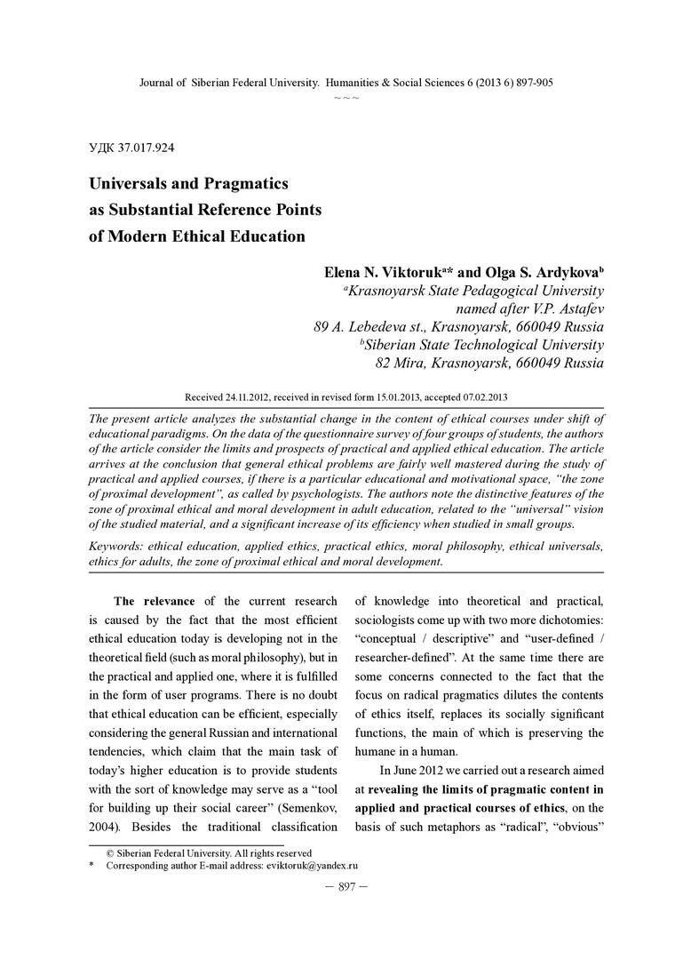 Библиографическое описание: Viktoruk, Elena. Universals and Pragmatics as Substantial Reference Points of Modern Ethical Education = Универсалии и прагматика как содержательные ориентиры современного этического образования / E. N. Viktoruk, O. S. Ardykova. - Текст : непосредственный // Журнал Сибирского федерального университета. Гуманитарные науки. - 2013. - Т. 6, № 6. - С. 897-905. - Библиогр.: с. 905 (5 назв.). - ISSN 1997-1370.