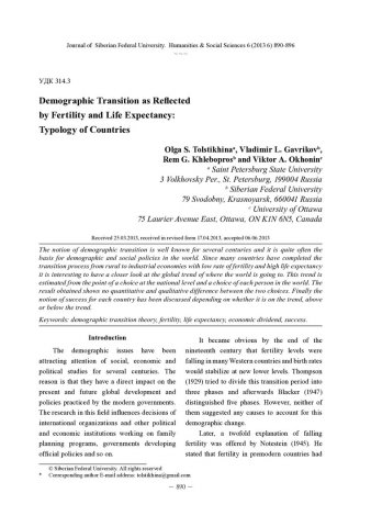 Библиографическое описание: Demographic Transition as Reflected by Fertility and Life Expectancy: Typology of Countries = Демографический переход в зеркале рождаемости и продолжительности жизни: типология стран / O. S. Tolstikhina [и др.]. - Текст : непосредственный // Журнал Сибирского федерального университета. Гуманитарные науки. - 2013. - Т. 6, № 6. - С. 890-896. - Библиогр.: с. 895 (6 назв.). - ISSN 1997-1370.