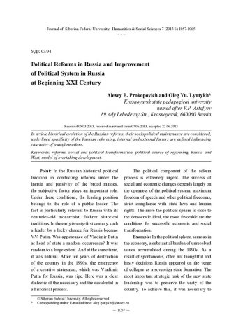 Библиографическое описание:Prokopovich, Alexey. Political Reforms in Russia and Improvement of Political System in Russia at Beginning XXI Century = Политические реформы в России и улучшение политической системы России в начале XXI века / A. E. Prokopovich, O. Yu. Lyutykh. - Текст : непосредственный // Журнал Сибирского федерального университета. Гуманитарные науки. - 2013. - Т. 6, № 7. - С. 1057-1065. - Библиогр.: с. 1064 (8 назв.). - ISSN 1997-1370.