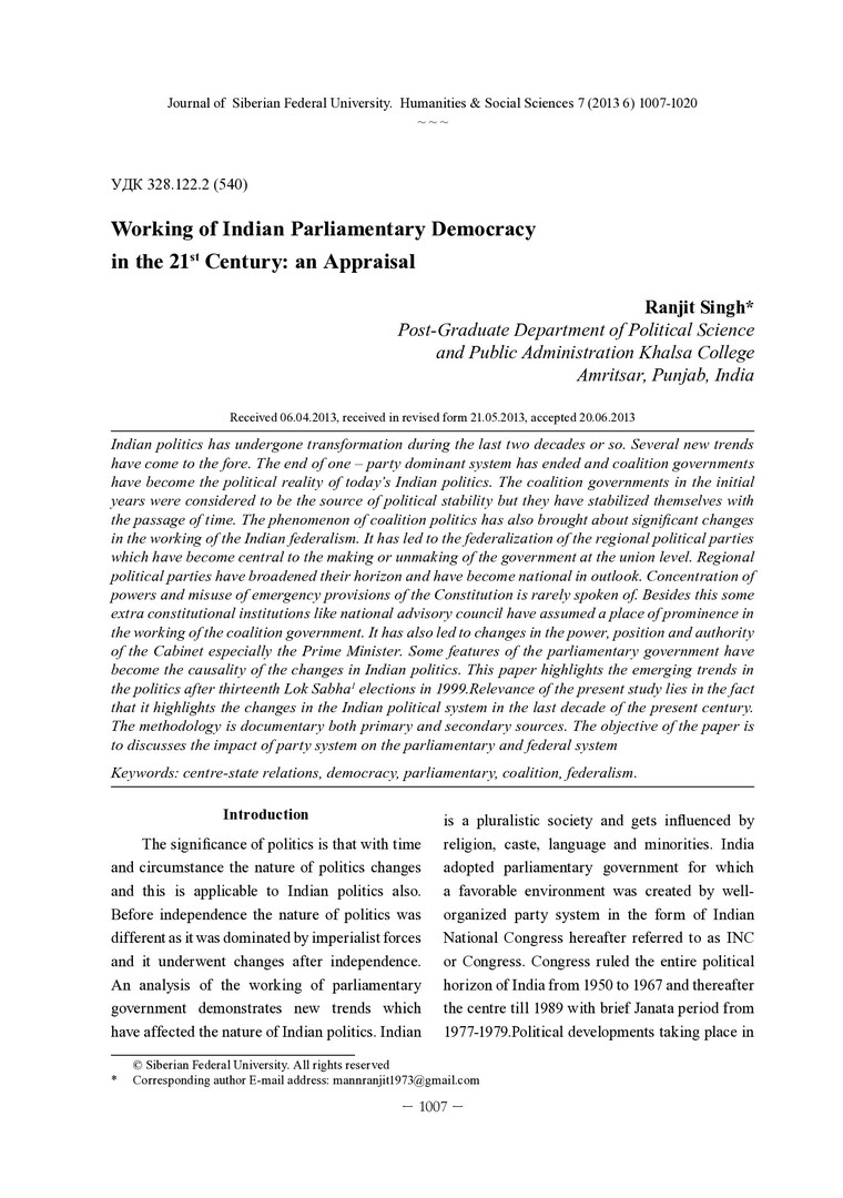 Working of Indian Parliamentary Democracy in the 21 Century: an Appraisalстатья из журнала