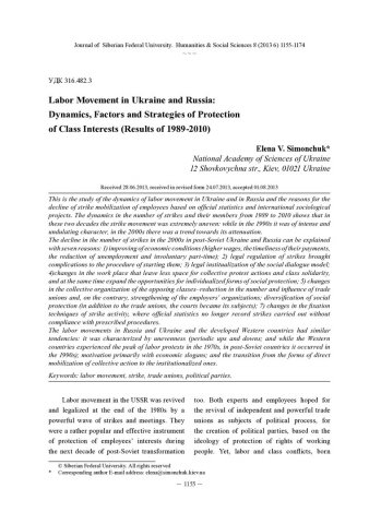 Библиографическое описание: Simonchuk, Elena. Labor Movement in Ukraine and Russia: Dynamics, Factors and Strategies of Protection of Class Interests (Results of 1989-2010) = Рабочее движение в Украине и России: динамика, причины, стратегии защиты классовых интересов (итоги 1989–2010 годов) / E. V. Simonchuk. - Текст : непосредственный // Журнал Сибирского федерального университета. Гуманитарные науки. - 2013. - Т. 6, № 8. - С. 1155-1174. - Библиогр.: с. 1171-1173 (39 назв.). - ISSN 1997-1370.