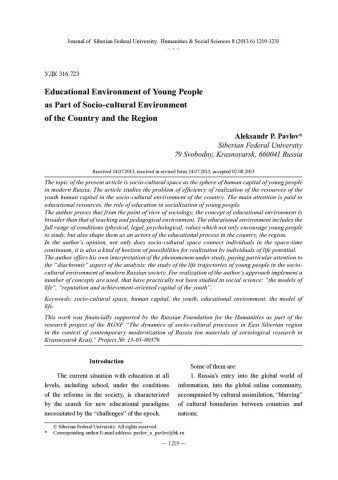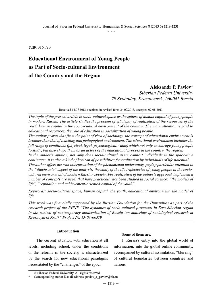 Библиографическое описание: Pavlov, Aleksandr. Educational Environment of Young People as Part of Socio-cultural Environment of the Country and the Region = Образовательная среда молодежи как составляющая социокультурного пространства страны и региона / A. P. Pavlov. - Текст : непосредственный // Журнал Сибирского федерального университета. Гуманитарные науки. - 2013. - Т. 6, № 8. - С. 1219-1231. - Библиогр.: с. 1230-1231 (10 назв.). - ISSN 1997-1370.