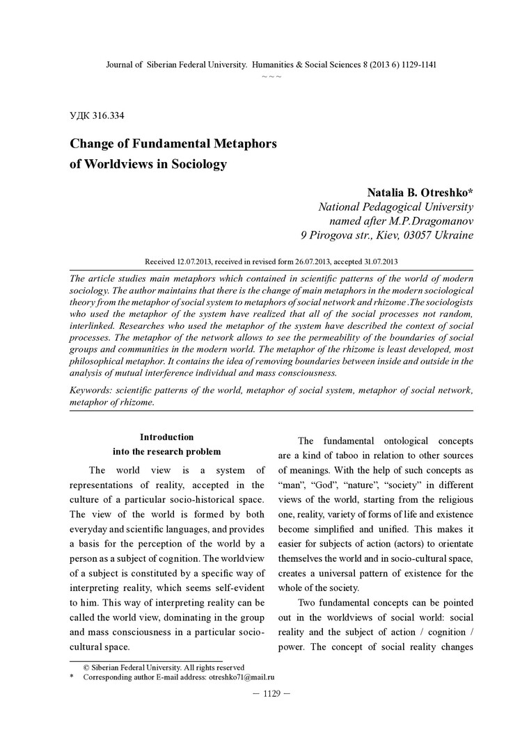 Библиографическое описание: Otreshko, Natalia. Change of Fundamental Metaphors of Worldviews in Sociology = Смена базовых метафор картин мира в социологии / N. B. Otreshko. - Текст : непосредственный // Журнал Сибирского федерального университета. Гуманитарные науки. - 2013. - Т. 6, № 8. - С. 1129-1141. - Библиогр.: с. 1140-1141 (12 назв.). - ISSN 1997-1370.