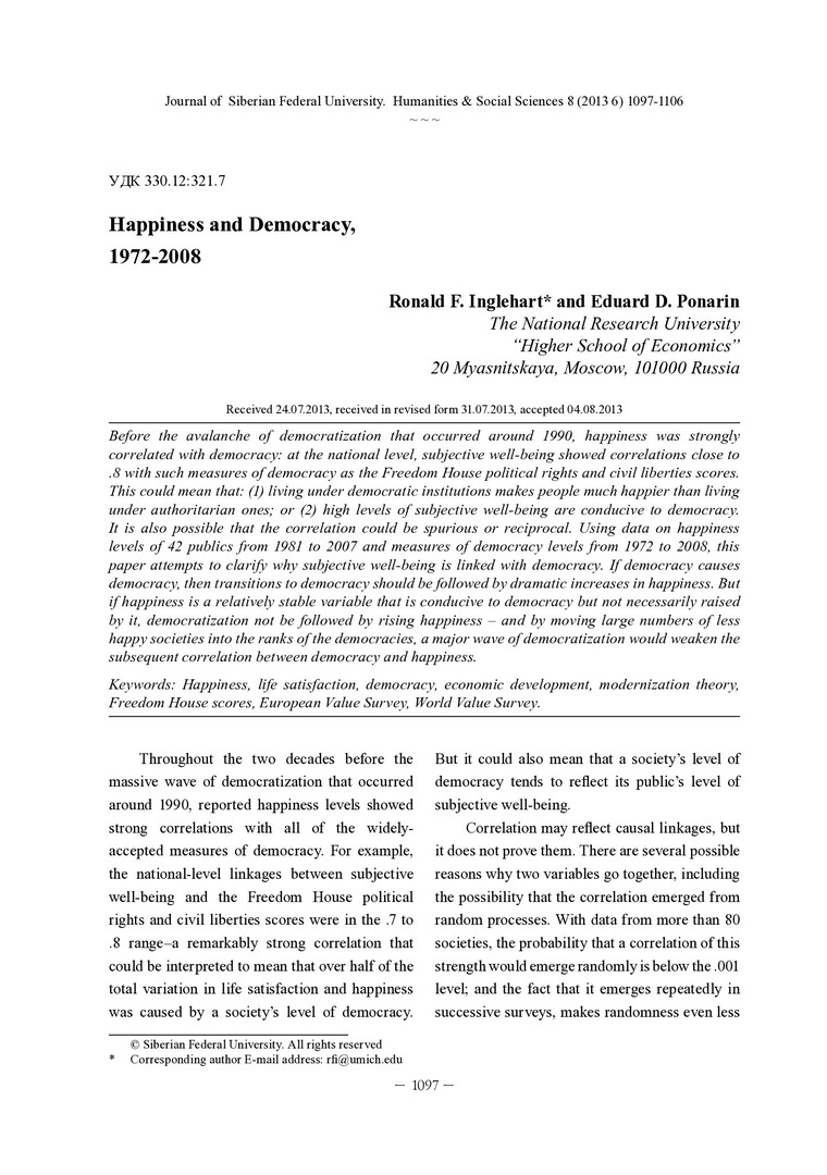 Библиографическое описание: Inglehart, Ronald. Happiness and Democracy, 1972-2008 = Счастье и демократия, 1972-2008 / R. F. Inglehart, E. D. Ponarin. - Текст : непосредственный // Журнал Сибирского федерального университета. Гуманитарные науки. - 2013. - Т. 6, № 8. - С. 1093-1106. - Библиогр.: с. 1105-1106 (13 назв.). - ISSN 1997-1370.