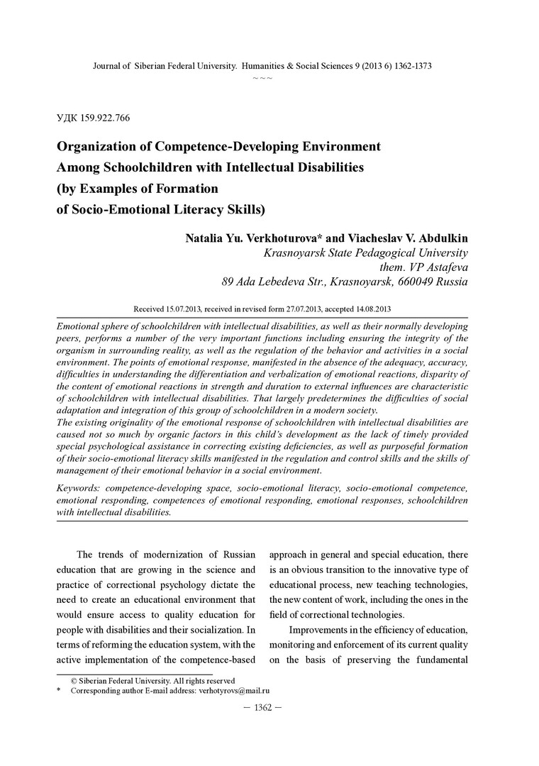 Библиографическое описание: Verkhoturova, Natalia. Organization of Competence-Developing Environment Among Schoolchildren with Intellectual Disabilities (by Examples of Formation of Socio-Emotional Literacy Skills) = Организация компетентностно - развивающего пространства в среде учащихся с нарушением интеллектуального развития (на примере формирования умений социоэмоциональной грамотности) / N. Yu. Verkhoturova, V. V. Abdulkin. - Текст : непосредственный // Журнал Сибирского федерального университета. Гуманитарные науки. - 2013. - Т. 6, № 9. - С. 1362-1373. - Библиогр.: с. 1367-1373 (50 назв.). - ISSN 1997-1370.