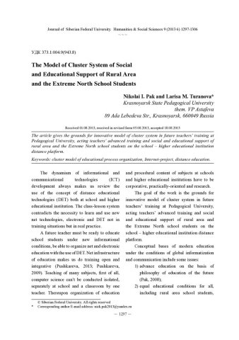 Библиографическое описание:Pak, Nikolai. The Model of Cluster System of Social and Educational Support of Rural Area and the Extreme North School Students = Модель кластерной системы социально-образовательной поддержки школьников сельской местности и Крайнего Севера / N. I. Pak, L. M. Turanova. - Текст : непосредственный // Журнал Сибирского федерального университета. Гуманитарные науки. - 2013. - Т. 6, № 9. - С. 1297-1306. - Библиогр.: с. 1305-1306 (14 назв.). - ISSN 1997-1370.