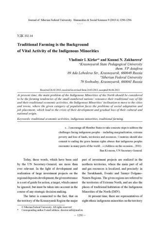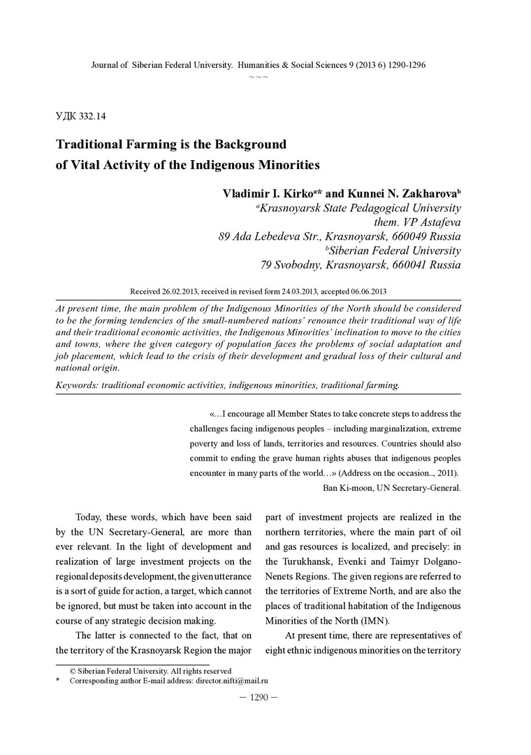 Библиографическое описание: Kirko, Vladimir. Traditional Farming is the Background of Vital Activity of the Indigenous Minorities = Традиционное хозяйство – основа жизнедеятельности коренных малочисленных народов / V. I. Kirko, K. N. Zakharova. - Текст : непосредственный // Журнал Сибирского федерального университета. Гуманитарные науки. - 2013. - Т. 6, № 9. - С. 1290-1296. - Библиогр.: с. 1295 (5 назв.). - ISSN 1997-1370.