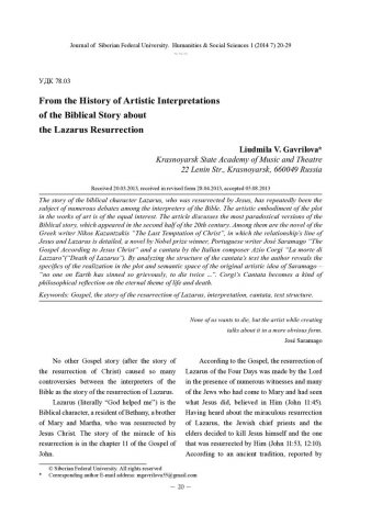 Аннотация: История о библейском персонаже Лазаре, воскрешенном Иисусом, неоднократно становилась предметом многочисленных споров толкователей библии. Не меньший интерес представляют и художественные воплощения сюжета в произведениях искусства. В статье рассматриваются наиболее парадоксальные версии библейской истории, появившиеся во второй половине ХХ века. Это роман греческого писателя Никоса Казандзакиса «Последнее искушение Христа», где подробно выписана линия взаимоотношений Иисуса и Лазаря, роман португальского писателя, нобелевского лауреата Жозе Сарамаго «Евангелие от Иисуса» и кантата итальянского композитора Ацио Корги «La morte di Lazzaro» («Смерть Лазаря»). На примере анализа текстовой структуры кантаты выявляется специфика реализации в сюжетно-смысловом пространстве оригинальной художественной идеи Сарамаго – «никто на свете не согрешил столь тяжко, чтобы умереть дважды…». Кантата Корги становится своеобразным философским размышлением на вечную тему о жизни и смерти.