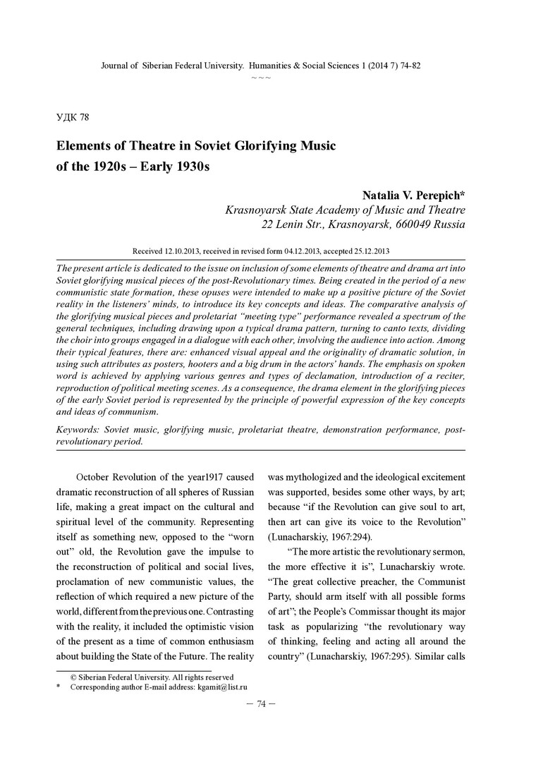 Библиографическое описание: Perepich, Natalia. Elements of Theatre in Soviet Glorifying Music of the 1920s – Early 1930s = Элементы театрализации в советской славильной музыке 1920-х – начала 1930-х годов / N. V. Perepich. - Текст : непосредственный // Журнал Сибирского федерального университета. Гуманитарные науки. - 2014. - Т. 7, № 1. - С. 74-82 : ил. - Библиогр.: с. 80-82 (16 назв.). - ISSN 1997-1370.