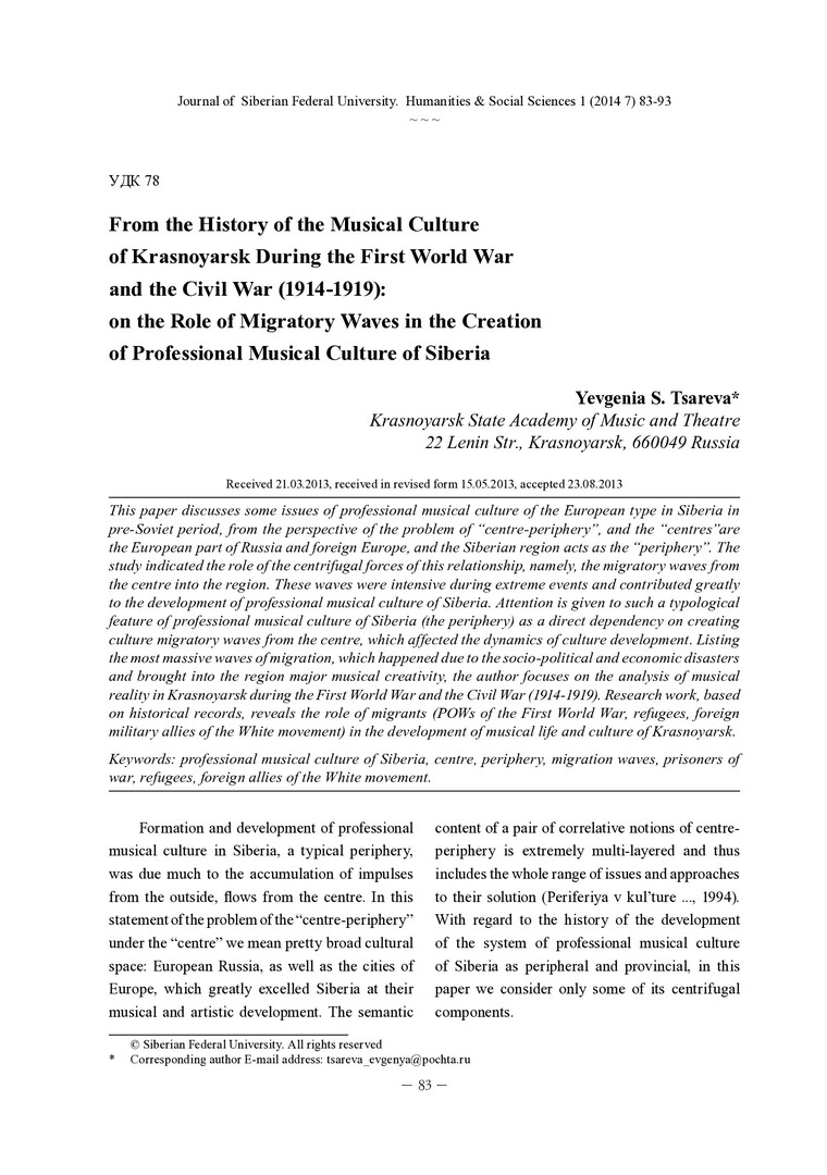 Библиографическое описание: Tsareva, Yevgenia. From the History of the Musical Culture of Krasnoyarsk During the First World War and the Civil War (1914-1919): on the Role of Migratory Waves in the Creation of Professional Musical Culture of Siberia = Из истории музыкальной культуры Красноярска в период Первой мировой и Гражданской войн (1914–1919): к вопросу о роли миграционных волн в формировании профессиональной музыкальной культуры Сибири / Ye. S. Tsareva. - Текст : непосредственный // Журнал Сибирского федерального университета. Гуманитарные науки. - 2014. - Т. 7, № 1. - С. 83-93. - Библиогр.: с. 91-93 (23 назв.). - ISSN 1997-1370.