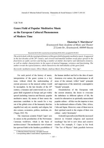 Библиографическое описание:Matviitseva, Ekaterina. Genre Field of Popular Meditative Music as the European Cultural Phenomenon of Modern Time = Жанровая сфера популярной медитативной музыки как феномен европейской культуры новейшего времени / E. V. Matviitseva. - Текст : непосредственный // Журнал Сибирского федерального университета. Гуманитарные науки. - 2014. - Т. 7, № 1. - С. 103-111 : ил. - Библиогр.: с. 110-111 (13 назв.). - ISSN 1997-1370.