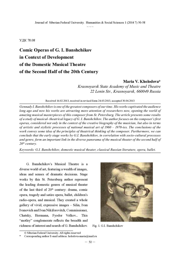 Библиографическое описание: Kholodova, Maria. Comic Operas of G. I. Banshchikov in Context of Development of the Domestic Musical Theatre of the Second Half of the 20th Century = Комические оперы Г. И. Банщикова в контексте развития отечественного музыкального театра 2-й половины XX века / M. V. Kholodova. - Текст : непосредственный // Журнал Сибирского федерального университета. Гуманитарные науки. - 2014. - Т. 7, № 1. - С. 50-58 : ил. - Библиогр.: с. 57-58 (2 назв.). - ISSN 1997-1370.