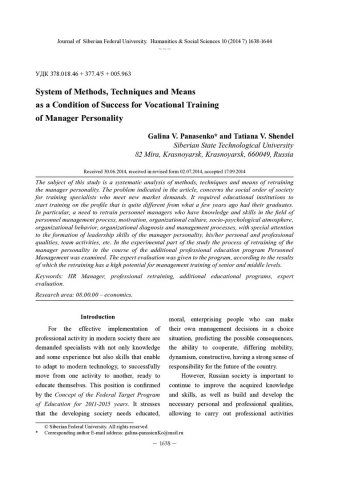 Библиографическое описание: Panasenko, Galina. System of Methods, Techniques and Means as a Condition of Success for Vocational Training of Manager Personality = Система методов, приемов и средств как условие успеха профессиональной переподготовки личности менеджера / G. V. Panasenko, T. V. Shendel. - Текст : непосредственный // Журнал Сибирского федерального университета. Гуманитарные науки. - 2014. - Т. 7, № 10. - С. 1638-1644. - Библиогр.: с. 1643-1644 (2 назв.). - ISSN 1997-1370.