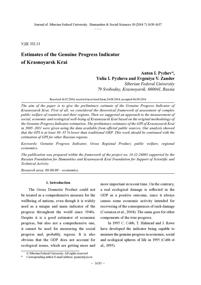 Библиографическое описание: Pyzhev, Anton. Estimates of the Genuine Progress Indicator of Krasnoyarsk Krai = Оценка истинного показателя прогресса Красноярского края / A. I. Pyzhev, Yu. I. Pyzheva, E. V. Zander. - Текст : непосредственный // Журнал Сибирского федерального университета. Гуманитарные науки. - 2014. - Т. 7, № 10. - С. 1630-1637. - Библиогр.: с. 1636-1637 (19 назв.). - ISSN 1997-1370.