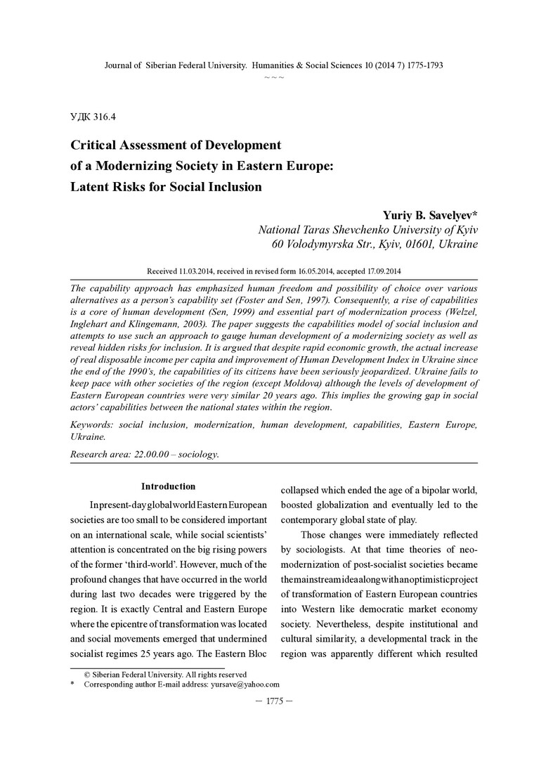 Библиографическое описание:Savelyev, Yuriy. Critical Assessment of Development of a Modernizing Society in Eastern Europe: Latent Risks for Social Inclusion = Критическая оценка развития модернизирующегося общества в Восточной Европе: скрытые риски для социальной включенности / Yu. B. Savelyev. - Текст : непосредственный // Журнал Сибирского федерального университета. Гуманитарные науки. - 2014. - Т. 7, № 10. - С. 1775-1793. - Библиогр.: с. 1791-1793 (42 назв.). - ISSN 1997-1370.
