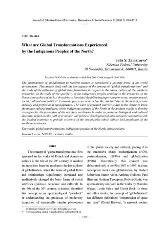 Библиографическое описание:Zamaraeva, Julia. What are Global Transformations Experienced by the Indigenous Peoples of the North? = Что такое глобальные трансформации, которые переживают индигенные народы севера? / Ju. S. Zamaraeva. - Текст : непосредственный // Журнал Сибирского федерального университета. Гуманитарные науки. - 2014. - Т. 7, № 10. - С. 1705-1718. - Библиогр.: с. 1712-1718 (72 назв.). - ISSN 1997-1370.