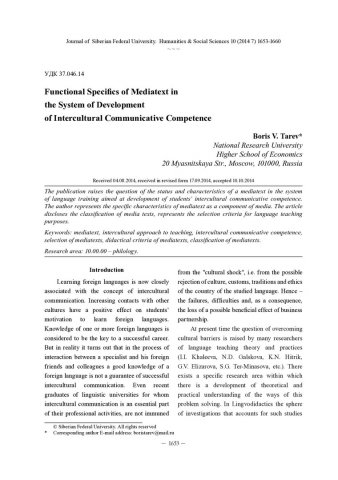 Библиографическое описание:Tarev, Boris. Functional Specifics of Mediatext in the System of Development of Intercultural Communicative Competence = Медиатекст в системе формирования межкультурной коммуникативной компетенции студентов / B. V. Tarev. - Текст : непосредственный // Журнал Сибирского федерального университета. Гуманитарные науки. - 2014. - Т. 7, № 10. - С. 1653-1660. - Библиогр.: с. 1659-1660 (4 назв.). - ISSN 1997-1370.