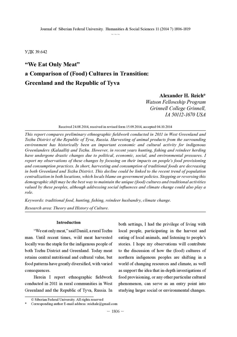 Библиографическое описание: Reich, Alexander. “We Eat Only Meat”. A Comparison of (Food) Cultures in Transition: Greenland and the Republic of Tyva = "Мы едим только мясо". Сравнительный анализ (пищевых) культур в переходном периоде: Гренландия и Республика Тува / A. H. Reich. - Текст : непосредственный // Журнал Сибирского федерального университета. Гуманитарные науки. - 2014. - Т. 7, № 11. - С. 1806-1819. - Библиогр.: с. 1817-1819 (22 назв.). - ISSN 1997-1370.
