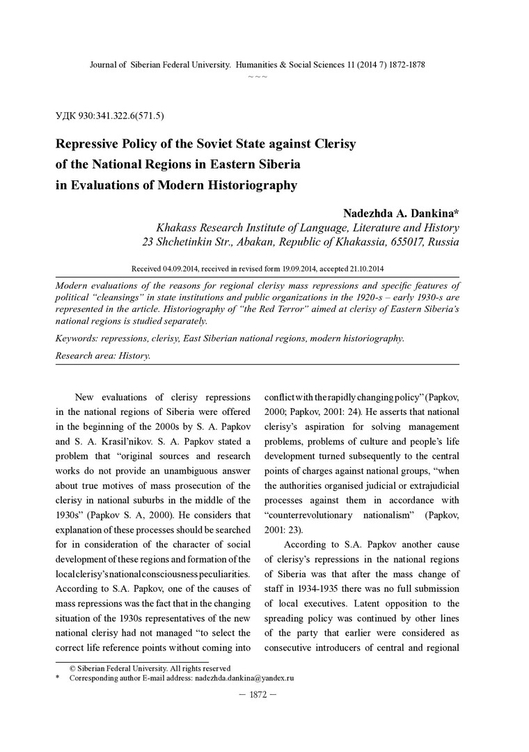 Библиографическое описание:Dankina, Nadezhda. Repressive Policy of the Soviet State against Clerisy of the National Regions in Eastern Siberia in Evaluations of Modern Historiography = Репрессивная политика Советского государства против творческой интеллигенции в национальных регионах Восточной Сибири в оценках современной историографии / N. A. Dankina. - Текст : непосредственный // Журнал Сибирского федерального университета. Гуманитарные науки. - 2014. - Т. 7, № 11. - С. 1872-1878. - Библиогр.: с. 1877-1878 (11 назв.). - ISSN 1997-1370.