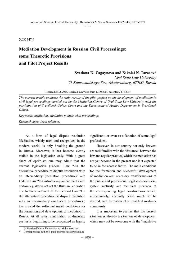 Библиографическое описание:Zagaynova, Svetlana. Mediation Development in Russian Civil Proceedings: some Theoretic Provisions and Pilot Project Results = Развитие медиации в гражданском судопроизводстве России: некоторые теоретические полагания и результаты пилотного проекта / S. K. Zagaynova, N. N. Tarasov. - Текст : непосредственный // Журнал Сибирского федерального университета. Гуманитарные науки. - 2014. - Т. 7, № 12. - С. 2070-2077. - ISSN 1997-1370.