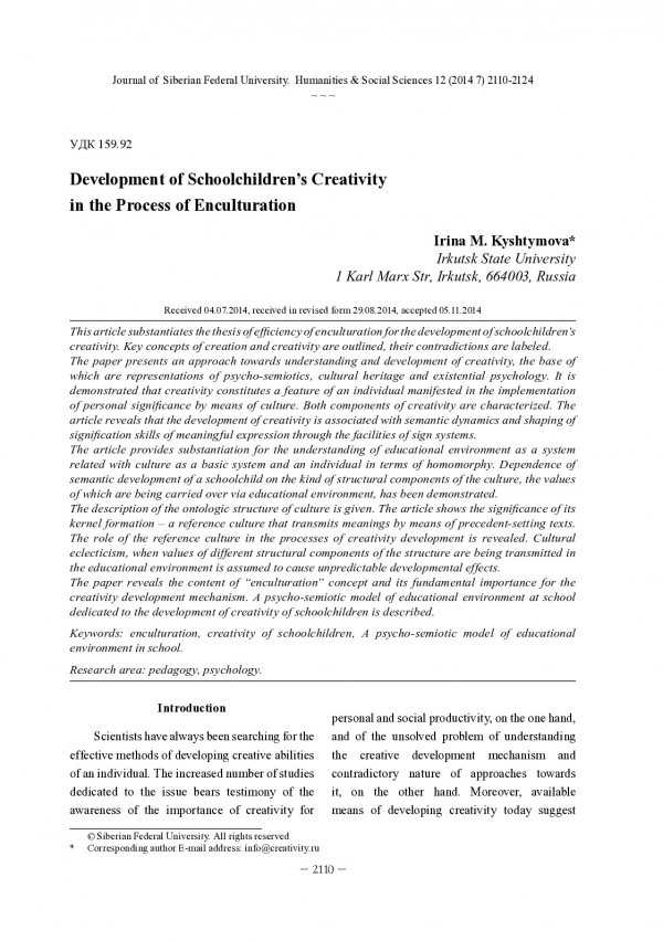 Development of Schoolchildren’s Creativity in the Process of Enculturationстатья из журнала