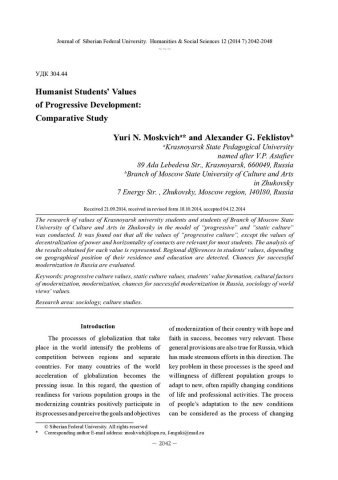 Библиографическое описание: Moskvich, Yuri. Humanist Students` Values of Progressive Development: Comparative Study = Ценности прогрессивного развития студентов-гуманитариев: компаративное сравнение / Yu. N. Moskvich, A. G. Feklistov. - Текст : непосредственный // Журнал Сибирского федерального университета. Гуманитарные науки. - 2014. - Т. 7, № 12. - С. 2042-2048. - Библиогр.: с. 2047-2048 (13 назв.). - ISSN 1997-1370.