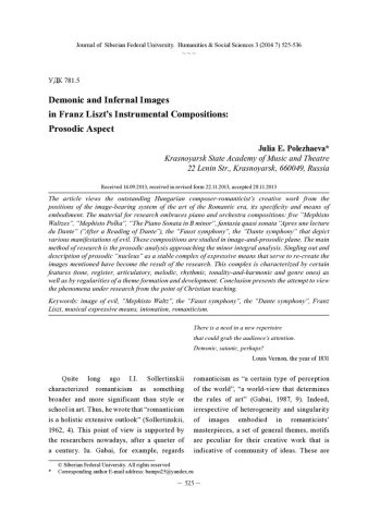 Библиографическое описание: Polezhaeva, Julia. Demonic and Infernal Images in Franz Liszt’s Instrumental Compositions: Prosodic Aspect = Демонические и инфернальные образы в инструментальных сочинениях Ференца Листа: интонационный аспект / J. Е. Polezhaeva. - Текст : непосредственный // Журнал Сибирского федерального университета. Гуманитарные науки. - 2014. - Т. 7, № 3. - С. 525-536 : ил. - Библиогр.: с. 535-536 (14 назв.). - ISSN 1997-1370.