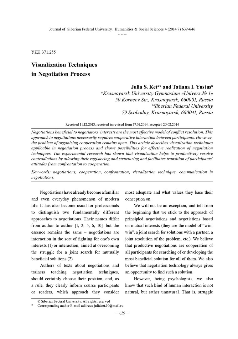 Библиографическое описание: Ket, Julia. Visualization Techniques in Negotiation Process = Техники визуализации в переговорном процессе / J. S. Ket, T. I. Yustus. - Текст : непосредственный // Журнал Сибирского федерального университета. Гуманитарные науки. - 2014. - Т. 7, № 4. - С. 639-646 : ил. - Библиогр.: с. 646 (10 назв.). - ISSN 1997-1370.