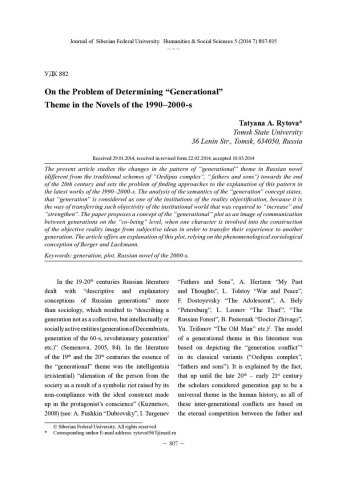 Библиографическое описание: Rytova, Tatyana. On the Problem of Determining “Generational” Theme in the Novels of the 1990–2000-s = К проблеме определения “поколенческого” сюжета в романах 1990–2000-х годов / T. А. Rytova. - Текст : непосредственный // Журнал Сибирского федерального университета. Гуманитарные науки. - 2014. - Т. 7, № 5. - С. 807-815. - Библиогр.: с. 813-815 (27 назв.). - ISSN 1997-1370.