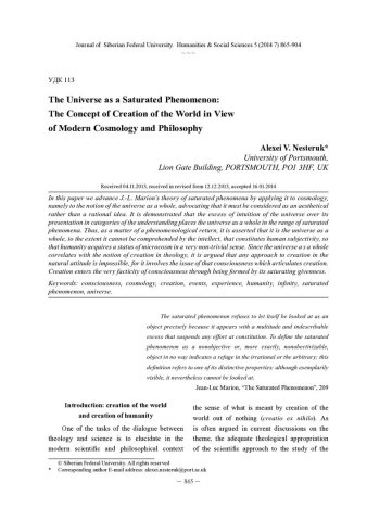 Библиографическое описание:Nesteruk, Alexei. The Universe as a Saturated Phenomenon: The Concept of Creation of the World in View of Modern Cosmology and Philosophy = Вселенная как насыщенный феномен: Концепция творения мира в свете современной космологии и философии / A. V. Nesteruk. - Текст : непосредственный // Журнал Сибирского федерального университета. Гуманитарные науки. - 2014. - Т. 7, № 5. - С. 865-904. - Библиогр.: с. 901-904 (62 назв.). - ISSN 1997-1370.
