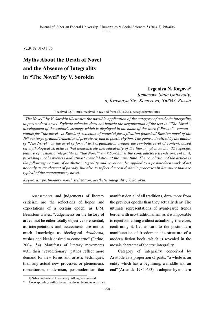 Библиографическое описание:Rogova, Evgeniya. Myths About the Death of Novel and the Absence of Integrality in “the Novel” by V. Sorokin = Мифы о конце романа и отсутствии целостности в “романе” В. Сорокина / E. N. Rogova. - Текст : непосредственный // Журнал Сибирского федерального университета. Гуманитарные науки. - 2014. - Т. 7, № 5. - С. 798-806. - Библиогр.: с. 805-806 (22 назв.). - ISSN 1997-1370.