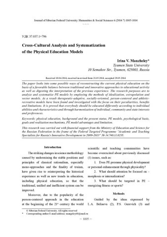 Аннотация: Проблема исследования связана с поиском путей реконструкции современного физического воспитания на основе осмысления богатейшего опыта его развития и нахождение разумного соотношения традиций и инноваций. Целью работы стал кросс-культурный анализ и систематизация моделей физического воспитания. Автором использованы методы идеализации, экстраполяции, векторного моделирования. В ходе исследования выделены и проанализированы оздоровительно-адаптивная, социально ориентированная, личностно ориентированная и спортивно-рекреативная модели физического воспитания. Показана их специфика, преимущества и ограничения для применения в практике современного физического воспитания.