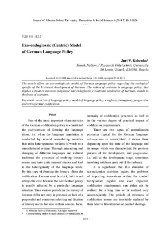 Библиографическое описание:Kobenko, Juri. Exo-endoglossic (Centric) Model of German Language Policy = Экзоэндоглоссная (центричная) модель регулирования современного немецкого языка / J. V. Kobenko. - Текст : непосредственный // Журнал Сибирского федерального университета. Гуманитарные науки. - 2014. - Т. 7, № 6. - С. 1015-1024 : ил. - Библиогр.: с. 1023-1024 (7 назв.). - ISSN 1997-1370.