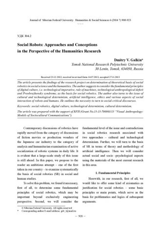 Библиографическое описание: Galkin, Dmitry. Social Robots: Approaches and Conceptions in the Perspective of the Humanities Research = Социальные роботы: подходы и концепции в перспективе гуманитарных исследований / D. V. Galkin. - Текст : непосредственный // Журнал Сибирского федерального университета. Гуманитарные науки. - 2014. - Т. 7, № 6. - С. 908-923. - Библиогр.: с. 921-923 (36 назв.). - ISSN 1997-1370.