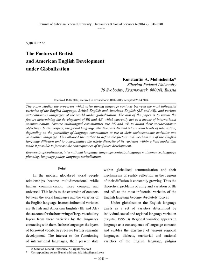 Библиографическое описание: Melnichenko, Konstantin. The Factors of British and American English Development under Globalisation = Факторы развития британского и американского вариантов английского языка в условиях глобализации / K. A. Melnichenko. - Текст : непосредственный // Журнал Сибирского федерального университета. Гуманитарные науки. - 2014. - Т. 7, № 6. - С. 1041-1048. - Библиогр.: с. 1047-1048 (10 назв.). - ISSN 1997-1370.