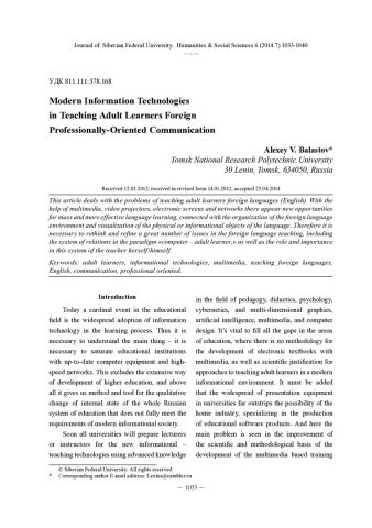 Библиографическое описание: Balastov, Alexey. Modern Information Technologies in Teaching Adult Learners Foreign Professionally-Oriented Communication = Cовременные информационные технологии при обучении взрослых, обучающихся иностранному профессионально ориентированному общению / A. V. Balastov. - Текст : непосредственный // Журнал Сибирского федерального университета. Гуманитарные науки. - 2014. - Т. 7, № 6. - С. 1033-1040. - Библиогр.: с. 1039-1040 (24 назв.). - ISSN 1997-1370.