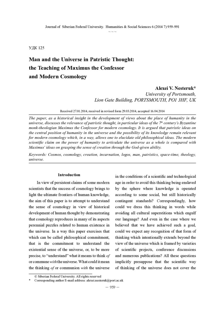 Библиографическое описание: Nesteruk, Alexei. Man and the Universe in Patristic Thought: the Teaching of Maximus the Confessor and Modern Cosmology = Человек и вселенная в патристической мысли: учение Максима Исповедника и современная космология / A. V. Nesteruk. - Текст : непосредственный // Журнал Сибирского федерального университета. Гуманитарные науки. - 2014. - Т. 7, № 6. - С. 959-991 : ил. - Библиогр.: с. 989-991 (41 назв.). - ISSN 1997-1370.
