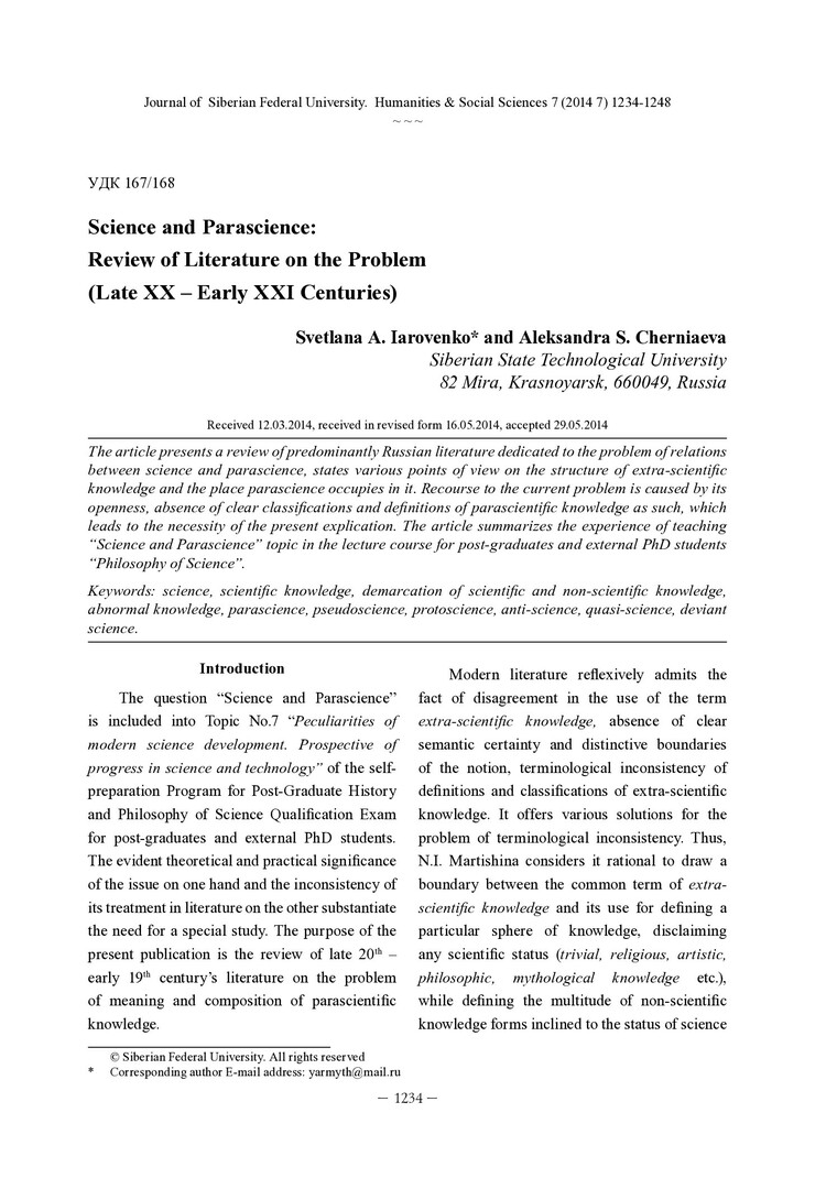 Библиографическое описание: Iarovenko, Svetlana. Science and Parascience: Review of Literature on the Problem (Late XX – Early XXI Centuries) = Наука и паранаука: обзор литературы по проблеме (конец XX – начало XXI века) / S. A. Iarovenko, A. S. Cherniaeva. - Текст : непосредственный // Журнал Сибирского федерального университета. Гуманитарные науки. - 2014. - Т. 7, № 7. - С. 1234-1248. - Библиогр.: с. 1247-1248 (21 назв.). - ISSN 1997-1370.