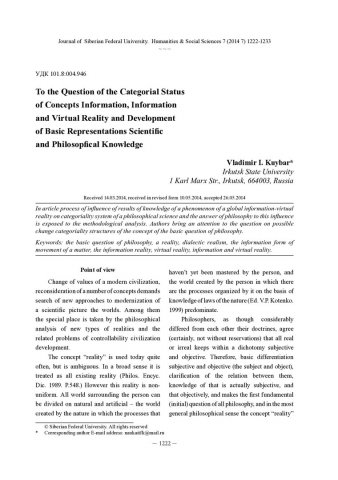 To the Question of the Categorial Status of Concepts Information, Information and Virtual Reality and Development of Basic Representations Scientific and Philosopfical Knowledge
