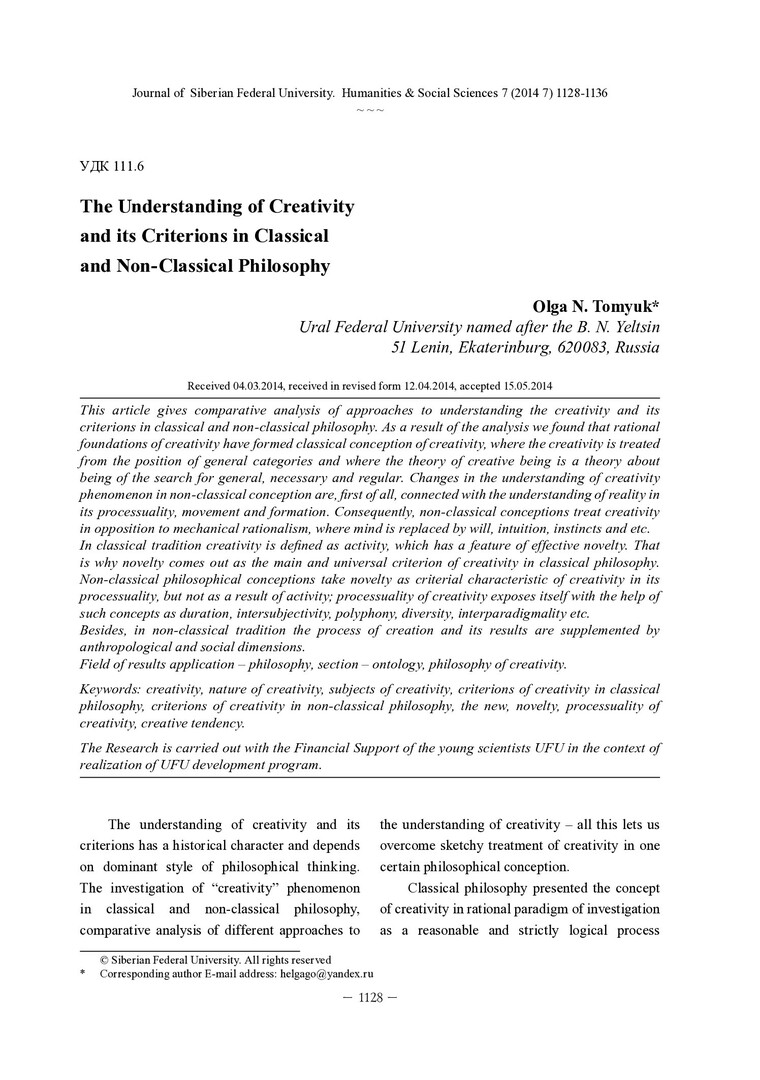 Библиографическое описание: Tomyuk, Olga. The Understanding of Creativity and its Criterions in Classical and Non-Classical Philosophy = Понимание творчества и его критериев в классической и неклассической философии / O. N. Tomyuk. - Текст : непосредственный // Журнал Сибирского федерального университета. Гуманитарные науки. - 2014. - Т. 7, № 7. - С. 1128-1136. - Библиогр.: с. 1135 (12 назв.). - ISSN 1997-1370.