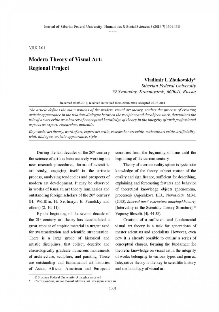 Библиографическое описание: Zhukovskiy, Vladimir. Modern Theory of Visual Art: Regional Project = Современная теория изобразительного искусства: региональный проект / V. I. Zhukovskiy. - Текст : непосредственный // Журнал Сибирского федерального университета. Гуманитарные науки. - 2014. - Т. 7, № 8. - С. 1301-1311. - Библиогр.: с. 1310-1311 (13 назв.). - ISSN 1997-1370.