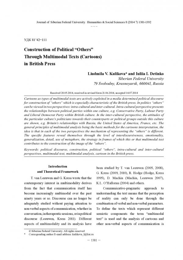 Библиографическое описание: Kulikova, Liudmila. Construction of Political "Other" Through Multimodal Texts (Cartoons) in British Press = Конструирование политических "чужих" через мультимодальные тексты (иллюстрации) в британской прессе / L. V. Kulikova, Iu. I. Detinko. - Текст : непосредственный // Журнал Сибирского федерального университета. Гуманитарные науки. - 2014. - Т. 7, № 8. - С. 1381-1392 : ил. - Библиогр.: с. 1390-1392 (20 назв.). - ISSN 1997-1370.