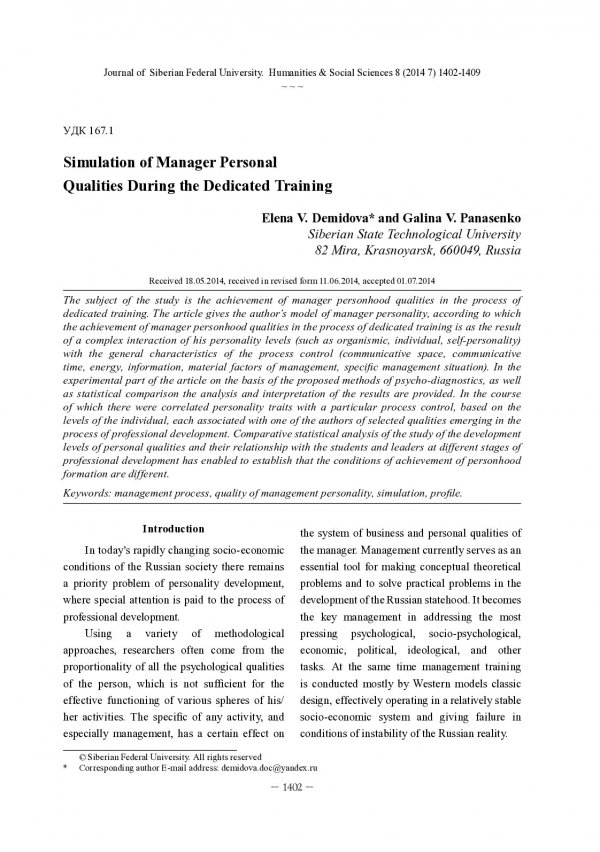 Библиографическое описание: Demidova, Elena. Simulation of Manager Personal Qualities During the Dedicated Training = Моделирование процесса образования личностных качеств менеджера в профессиональной подготовке / E. V. Demidova, G. V. Panasenko. - Текст : непосредственный // Журнал Сибирского федерального университета. Гуманитарные науки. - 2014. - Т. 7, № 8. - С. 1402-1409 : ил. - Библиогр.: с. 1409 (6 назв.). - ISSN 1997-1370.