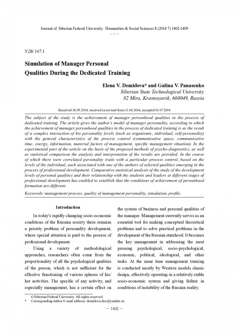 Simulation of Manager Personal Qualities During the Dedicated Trainingстатья из журнала