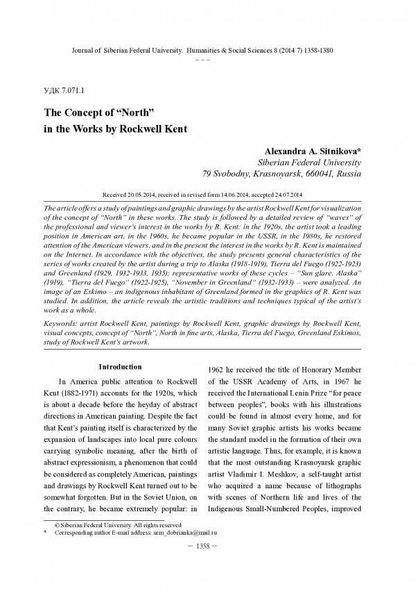 Библиографическое описание: Sitnikova, Alexandra. The Concept of "North" in the Works by Rockwell Kent = Концепт "север" в творчестве Рокуэлла Кента / A. A. Sitnikova. - Текст : непосредственный // Журнал Сибирского федерального университета. Гуманитарные науки. - 2014. - Т. 7, № 8. - С. 1358-1380 : ил. - Библиогр.: с. 1376-1380 (66 назв.). - ISSN 1997-1370.
