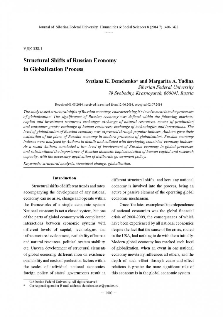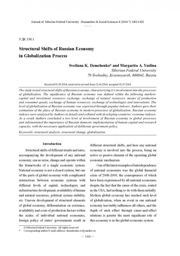 Библиографическое описание:Demchenko, Svetlana. Structural Shifts of Russian Economy in Globalization Process = Структурные сдвиги российской экономики в процессе глобализации / S. K. Demchenko, M. A. Yudina. - Текст : непосредственный // Журнал Сибирского федерального университета. Гуманитарные науки. - 2014. - Т. 7, № 8. - С. 1410-1422 : ил. - Библиогр.: с. 1421 (6 назв.). - ISSN 1997-1370.