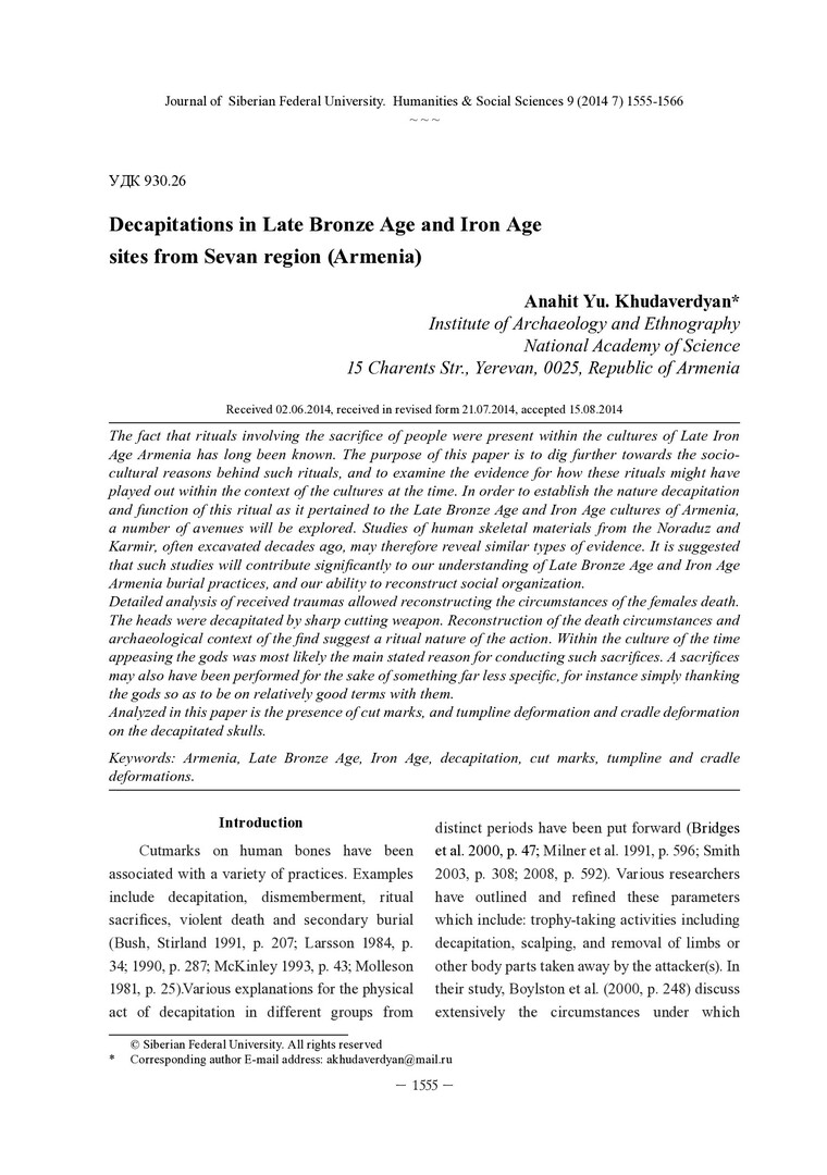 Библиографическое описание: Khudaverdyan, Anahit. Decapitations in Late Bronze Age and Iron Age sites from Sevan region (Armenia) = Обезглавливания в эпоху поздней бронзы и в железном веке в группах из Севанской области (Армения) / A. Yu. Khudaverdyan. - Текст : непосредственный // Журнал Сибирского федерального университета. Гуманитарные науки. - 2014. - Т. 7, № 9. - С. 1555-1566 : ил. - Библиогр.: с. 1563-1565 (46 назв.). - ISSN 1997-1370.