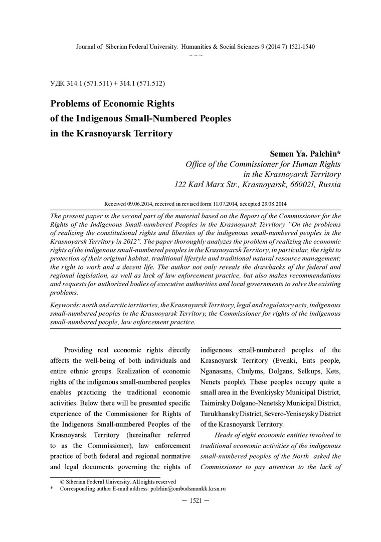 Библиографическое описание:Palchin, Semen. Problems of Economic Rights of the Indigenous Small-Numbered Peoples in the Krasnoyarsk Territory = Проблемы реализации экономических прав коренных малочисленных народов Красноярского края / S. Ya. Palchin. - Текст : непосредственный // Журнал Сибирского федерального университета. Гуманитарные науки. - 2014. - Т. 7, № 9. - С. 1521-1540. - Библиогр.: с. 1536-1540 (42 назв.). - ISSN 1997-1370.